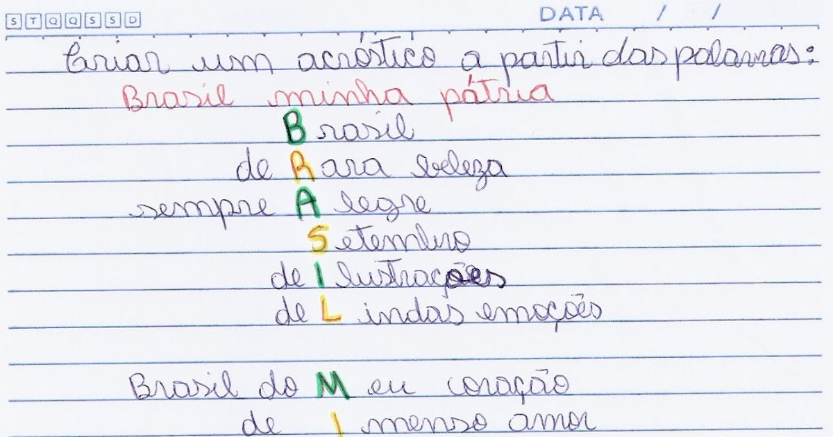 O acróstico trata-se de uma poesia na qual as primeiras letras das palavras (em alguns casos, as letras do fim ou do meio) de cada verso formam, verticalmente, um nome/conceito ou mais.. Vamos ao acróstico: P aís. A amado. T erra. R ica. I nigualável. A adorado. A legre. M istura. A autêntico. D diferente. A nimado. B rasileiros. R esilientes. A udaciosos. S ábios. I ncomparáveis. L ivres