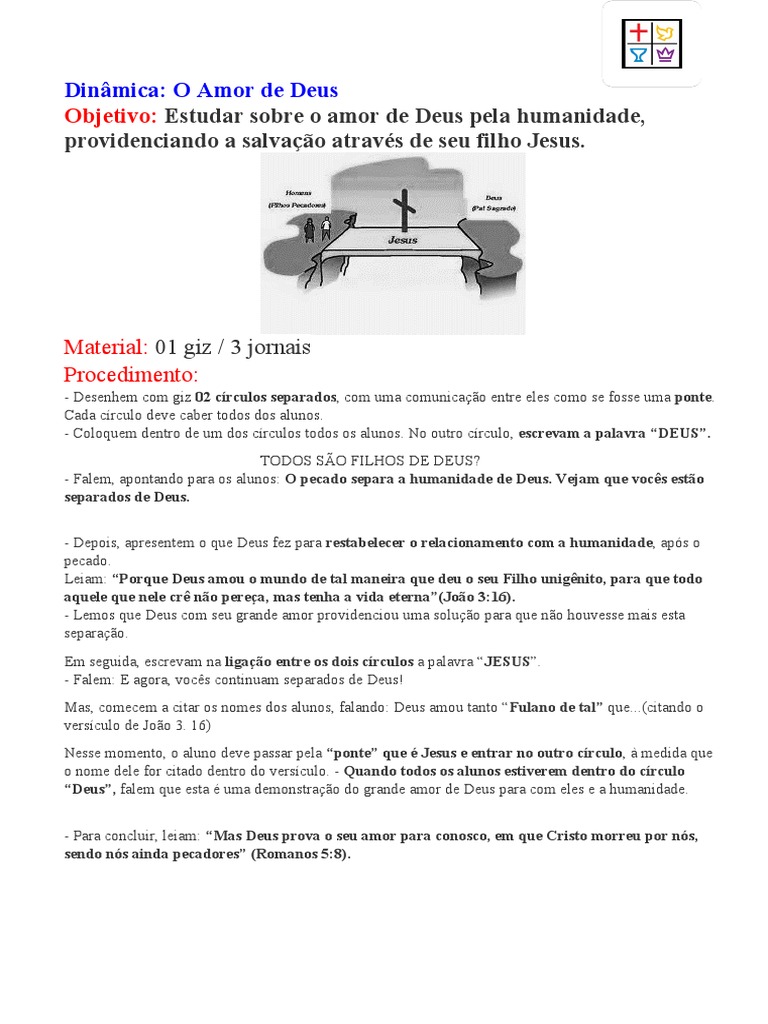Esclareça que a salvação é um dom, ou melhor, um presente que o Senhor nos oferece (Rm 5.21). Este presente é recebido mediante a nossa fé e arrependimento de pecado. Professor, aproveite a oportunidade e pergunte se alguém gostaria de receber este presente de Deus e entregar sua vida a Jesus. Dinâmica: O Amor de Deus