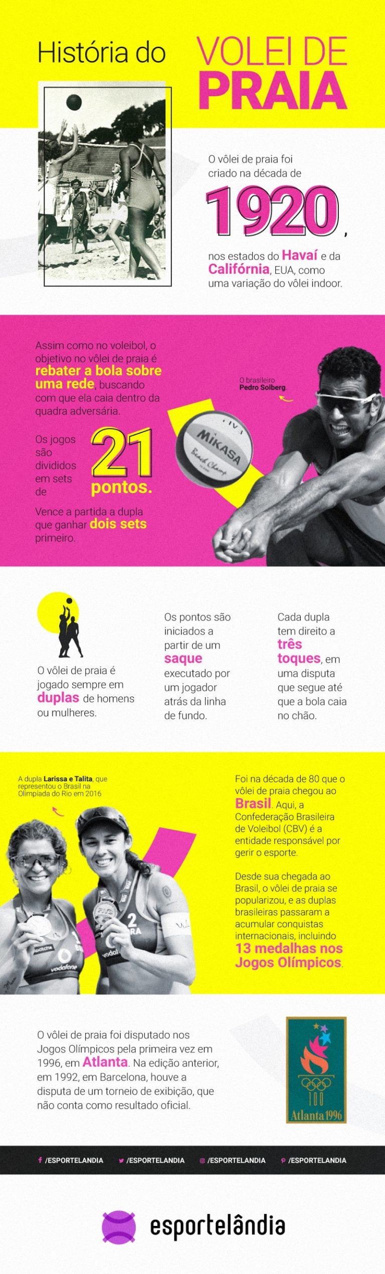História. O voleibol (vôlei) de praia surgiu nas praias de Santa Maria, na Califórnia (EUA), em 1895, como uma variação do voleibol de quadra. Com o tempo e o crescimento do número de adeptos, foi realizado o primeiro torneio oficial da modalidade na Califórnia, em 1947. Essa iniciativa culminou na fundação da California Beach.