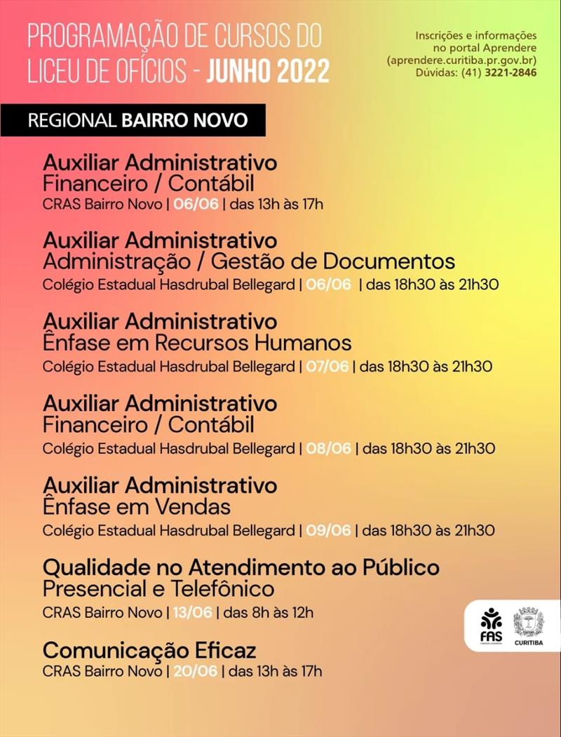 O programa Liceu de Ofícios e Inovação de Curitiba está com 1.495 vagas abertas para 31 cursos gratuitos de desenvolvimento pessoal e qualificação profissional que ocorrem no mês de julho. 468 vagas são destinadas para pessoas em situação de vulnerabilidade e risco social atendidas pela Fundação de Ação Social (FAS).