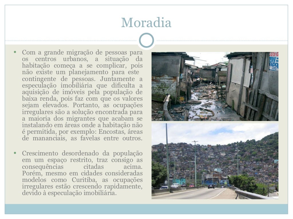 A macrocefalia urbana e a favelização são consequências da urbanização brasileira. A urbanização brasileira se intensificou a partir da década de 1950 em função de fatores como o êxodo.