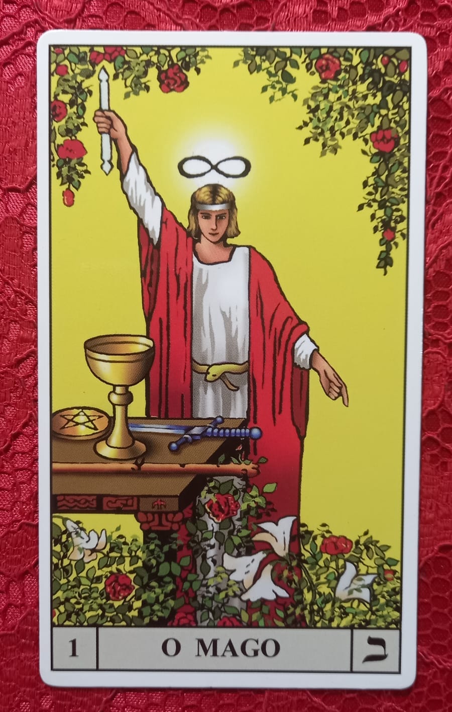 A Carta do Tarô: O Mago. O Mago, um jovem corajoso, forte, diante de uma encruzilhada. Nesta carta, nos deparamos com Hermes, deus dos viajantes, patrono dos ladrões e trapaceiros, protetor da magia e da adivinhação, responsável pelas mudanças súbitas na vida. Sua dualidade consiste em ser trapaceiro e, ao mesmo tempo, é o mensageiro.