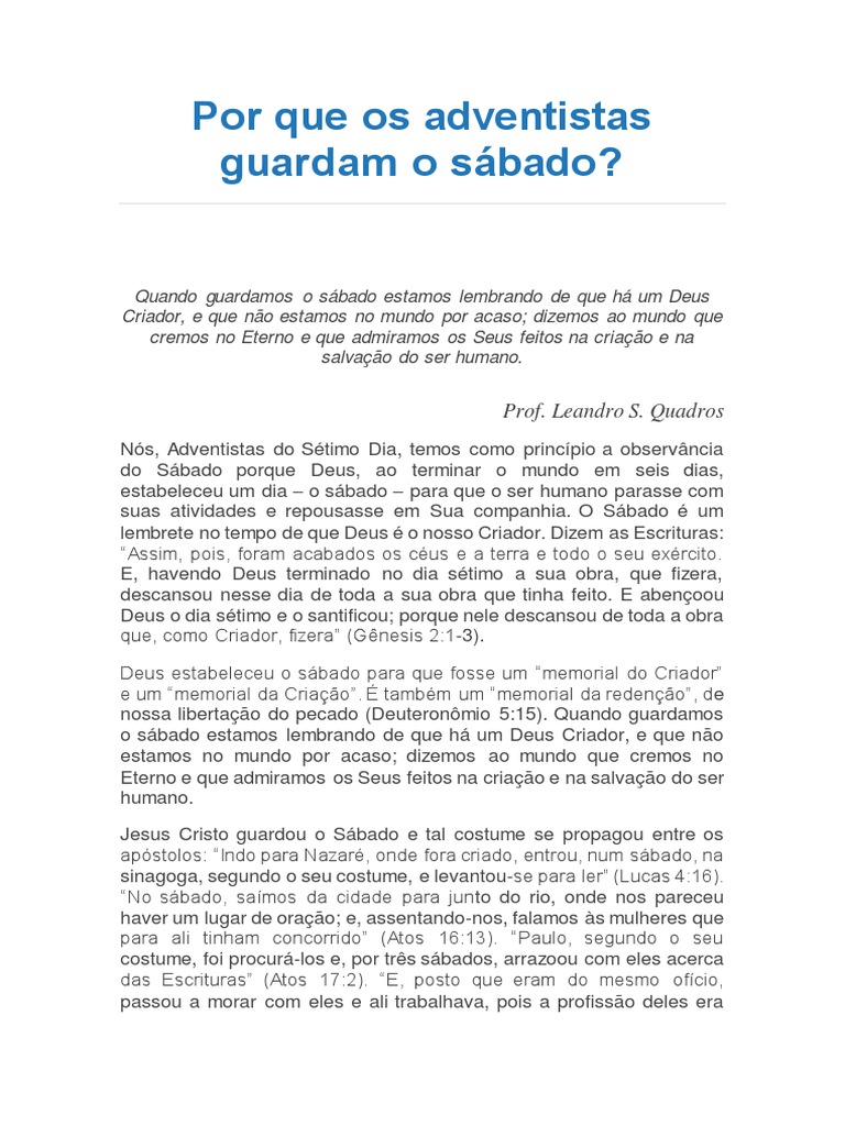 POR QUE OS ADVENTISTAS DO SÉTIMO DIA GUARDAM O SÁBADO? Blog do Seu Alipio