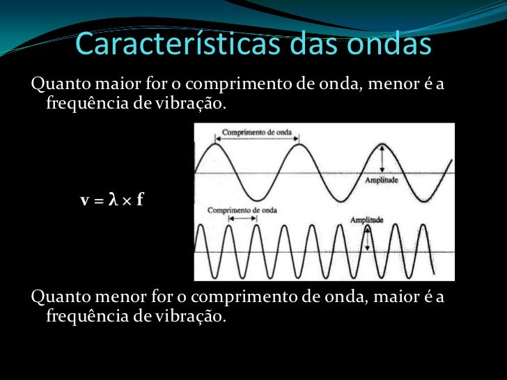 Ondas são perturbações no espaço, e possuem: amplitude (A) comprimento de onda (λ) frequência (f) velocidade (V) A velocidade de uma onda é calculada pelas equações: V = λ . f ou V = λ/T, e a unidade de medida é m/s. Essa velocidade depende do meio: em meios gasosos, a velocidade é menor que em meios sólidos.