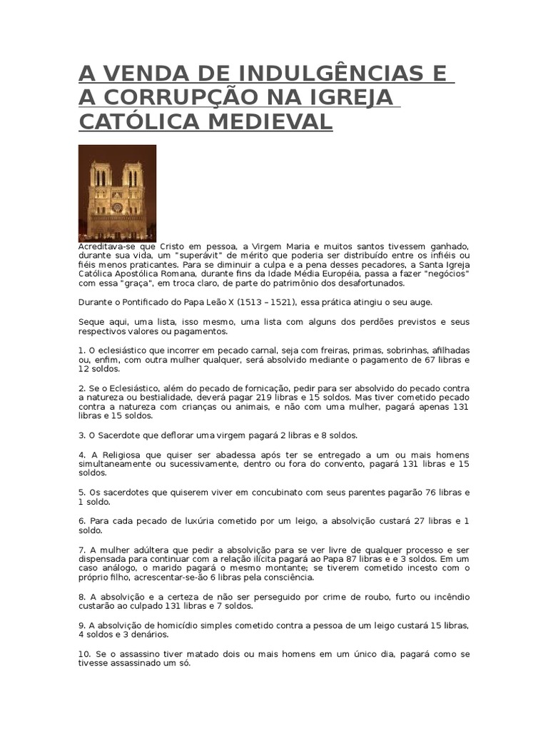 A Venda de Indulgências e A Corrupção Na Igreja Católica PDF Indulgência Igreja católica