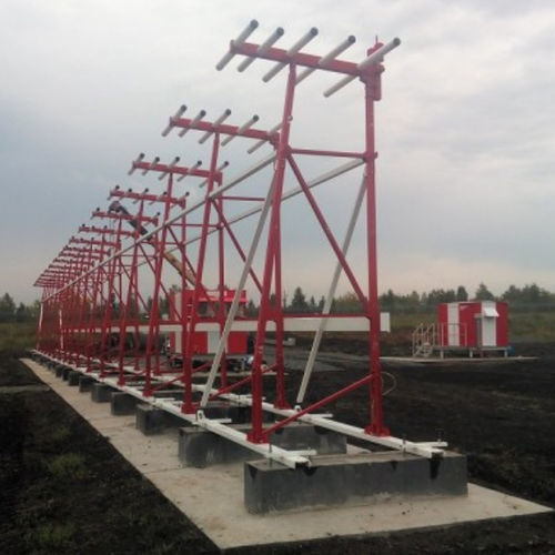sistema de pouso por instrumento Imagem. Conjunto localizador de antenas refletora dipolo de 21 elementos do sistema de pouso por instrumento, na Pista 27R, do Aeroporto Internacional de Hannover/Langenhagen - EDDV. A imagem mostra a parte de trás do Sistema de antenas.